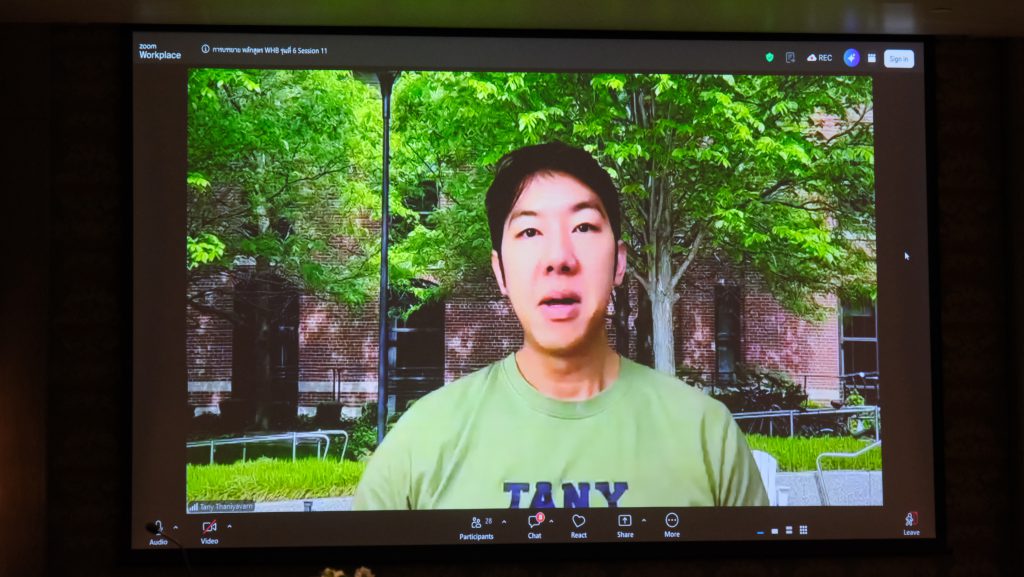 เวลา 18.30 น. หลักสูตร WHB รุ่นที่ 6 ได้รับเกียรติจาก นายแพทย์ธนีย์ ธนียวัน แพทย์ผู้เชี่ยวชาญด้านโรคปอด การปลูกถ่ายปอดและวิกฤตบำบัด และอดีตอาจารย์ คณะแพทยศาสตร์ มหาวิทยาลัยฮาร์วาร์ด ประเทศสหรัฐอเมริกา บรรยายผ่านระบบออนไลน์ (Zoom) ในหัวข้อ “Young Gen Wellness 360° : Physical Strength and Mental Resilience” ท่านได้กล่าวว่าข้อจำกัดด้านเวลาถือเป็นอุปสรรคสำคัญในการปรับเปลี่ยนพฤติกรรมสุขภาพ การออกกำลังกายแบบ HIIT (High-Intensity Interval Training) เป็นรูปแบบการฝึกที่สลับความเข้มข้นของการออกแรงในระดับสูงสุดกับช่วงพักฟื้นในระยะเวลาสั้นๆ โดยมีหลักฐานเชิงประจักษ์ทางวิทยาศาสตร์สนับสนุนประสิทธิภาพในหลายมิติ ยกตัวอย่างเช่น