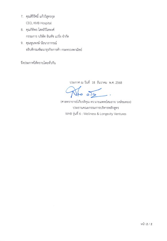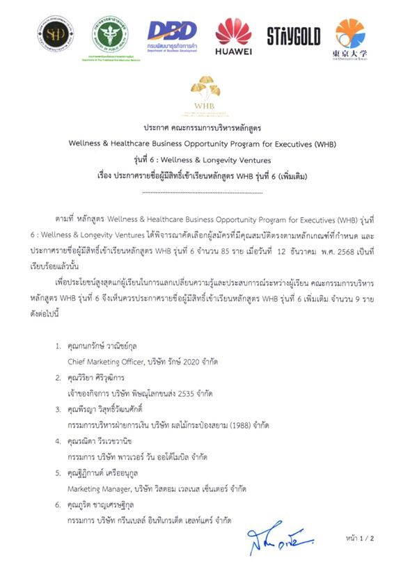 ประกาศรายชื่อ(เพิ่มเติม)ผู้มีสิทธิ์เข้าเรียนหลักสูตร Wellness & Healthcare Business Opportunity Program For Executives (WHB) รุ่นที่ 6 ณ วันที่ 19 ธันวาคม พ.ศ.2568